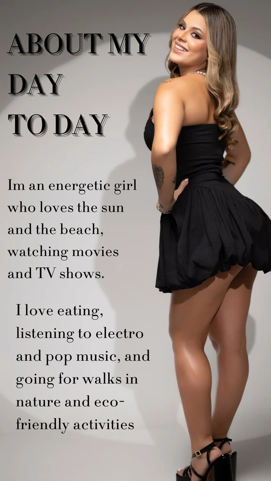 Soy una chica con energía a la que le encanta el sol y la playa; ver películas y series. Me gusta mucho comer, la música electro y pop. Pasear por la naturaleza y planes ecologicos. Me encanta conocer gente y culturas nuevas. Me encantan los animales, especialmente los gatos (tengo uno que se llama "night"). Creo que soy una chica de mente abierta a la que le encanta conocer los deseos de las personas...